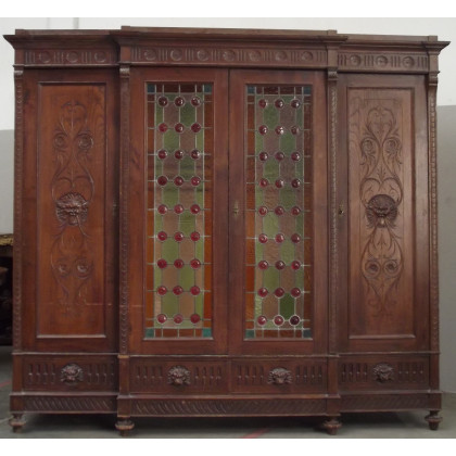 Armadio con fronte sagomato a quattro ante, intagliato a mascheroni e a motivi vegetali, quattro cassetti nella base, due ante centrali decorate con vetri policromi legati al piombo (cm 236x232x67)(difetti)