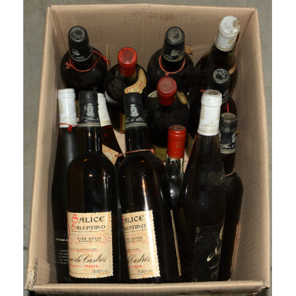 Lotto composto da tredici bottiglie di vino principalmente del Salento (difetti)