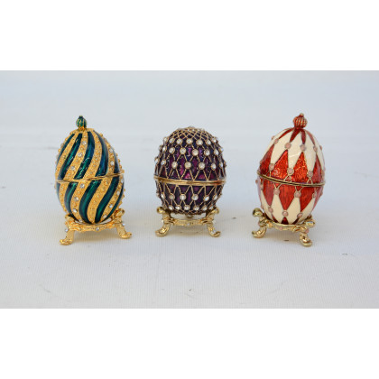 Lotto di tre uova stile Farbergé in metallo smaltato e decorato con strass