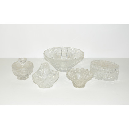 Lotto di cinque contenitori in vetro molato di cui due con coperchio (lievi difetti)