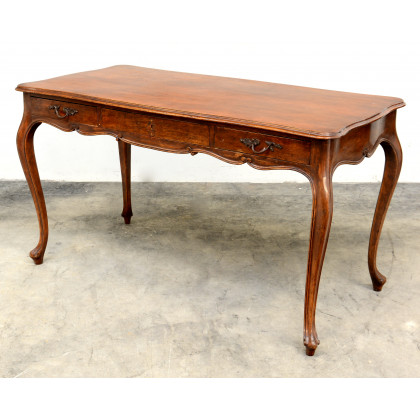 Scrittoio da centro in noce con tre cassetti sottopiano e gambe mosse, sec XX (cm 138x78x70) (difetti)