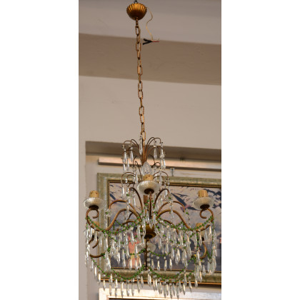 Lampadarietto a sei fiamme in metallo, gocce e perlinature in vetro (h. cm 58)