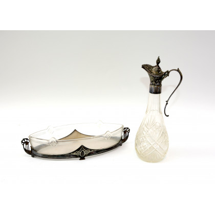 Lotto composto da versatoio e un centrotavola in metallo argentato e cristallo