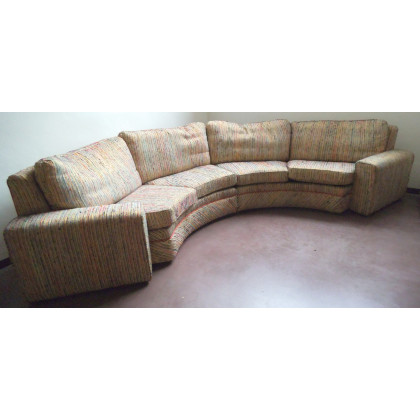 Divano a quattro posti a semicerchio, rivestito con stoffa policroma e dorata, produzione italiana anni Ottanta del sec. XX (cm 340x80x90) (difetti)