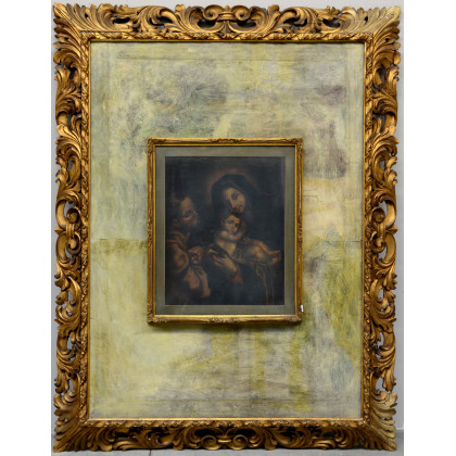 Scuola del XVIII Secolo "Sacra Famiglia" olio su tela (cm 50x40) in doppia cornice in legno intagliato e dorato (ingombro massimo cm 155x122)