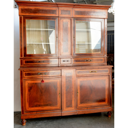 Mobile a due corpi lastronato e filettato in noce e mogano. Parte inferiore a due ante e due cassetti, parte superiore a tre cassetti e due ante a vetro. Piedi a cipolla (cm 165x206x55) (lievi difetti)