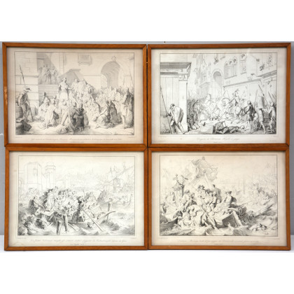 Lotto di quattro incisioni raffiguranti scene storiche (cm 25,5x35,5), in cornici (difetti)