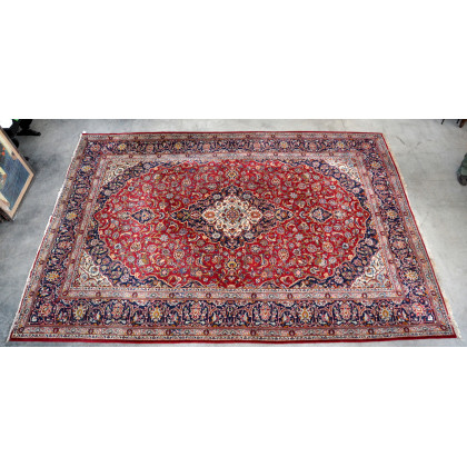 Tappeto Keshan, Persia secolo XX. Disegno a medaglione blu su fondo rosa con decoro di rami fioriti (413x295) (difetti)