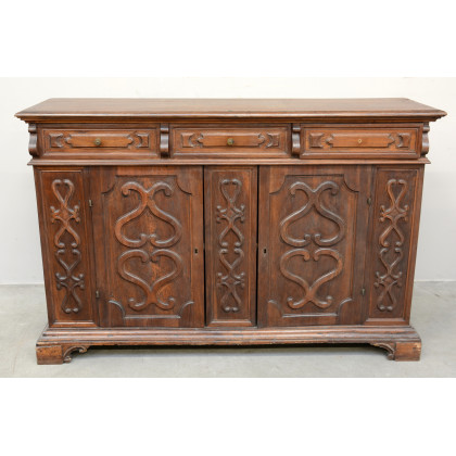 Credenza in stile piemontese a tre ante e tre cassetti pannellati e decorati a volute (cm 155x105x47) (difetti)