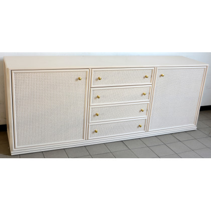 Mobile credenza con quattro cassetti e due ante in legno laccato color crème parzialmente rivestito in paglia di Vienna. Italia, produzione recente (cm 200x76,5x46) (lievi difetti)