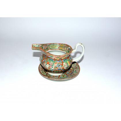 Manifattura di Cina, seconda metà sec. XIX. Lotto composto da un piattino in porcellana Famiglia Rosa cantonese con decoro floreale e un versatoio (l. max. 18 cm.)