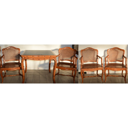 Lotto composto da un tavolo quadrato in legno dolce con gambe e profili mossi simulanti il bambù, piano con inserto in similpelle nera, e quattro poltroncine en suite (cm 86x76x86) (lievi difetti)