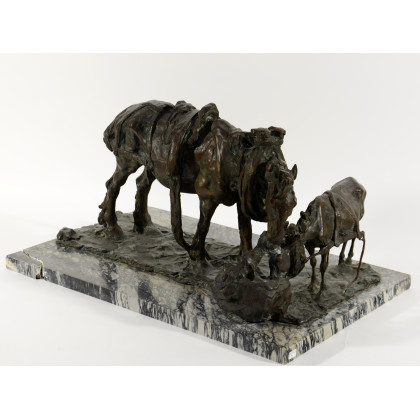 "Animali alla fonte" gruppo scultoreo in bronzo (h cm 26) firmato alla base (base in marmo) (mancanze ala base)