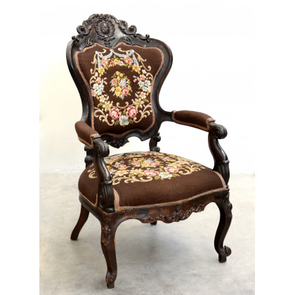 Poltrona Luigi Filippo in noce con cimasa scolpita a stemma rivestita in tessuti a piccolo punto a fiori