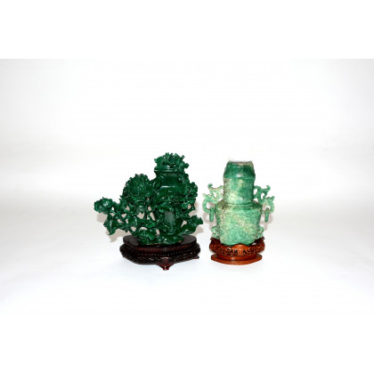 Lotto di sculture in malachite e pitre dure con vasi e fiori, basi in legno, Cina, sec. XX (h cm 20 ca.) (difetti)
