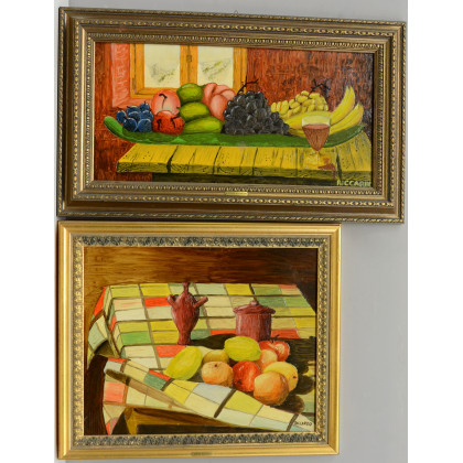 Lotto di due dipinti ad olio raffiguranti nature morte con frutta, misure differenti, in cornici (lievi difetti)