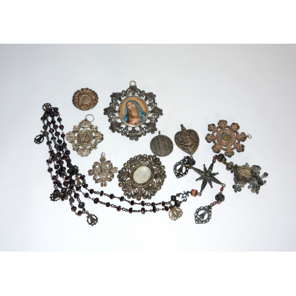 Lotto composto da nove oggetti in argento e filigrana d’argento tra cui un rosario, pendenti e cornici (difetti)