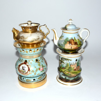 Due veilleuse in porcellana decorate in policromia a paesaggi, fiori e volatili. Sec. XIX