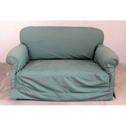 Divano a due posti con braccioli e schienale sagomato, gambe in legno laccato