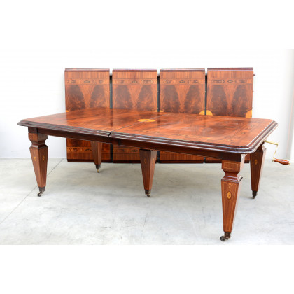 * Grande tavolo da pranzo a manovella in stile inglese con piano decorato a motivi vegetali, gambe rastremate a motivi stilizzati munite di rotelle (cm chiuso 220x122, aperto cm 452x122 ca.) (difetti)