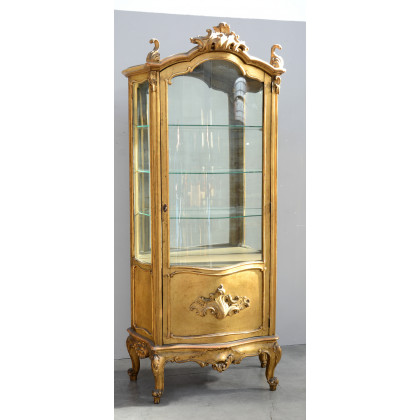 Vetrina di forma sagomata in legno dorato con anta a vetri sul fronte. Cimasa, fascia e piedini intagliati a motivi vegetali. Inizio sec. XX (cm 85x187x37)