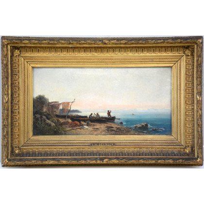 "Paesaggio marino con pescatori". Olio su tela (cm 31x64). Firmato e datato in basso a sinistra. In cornice