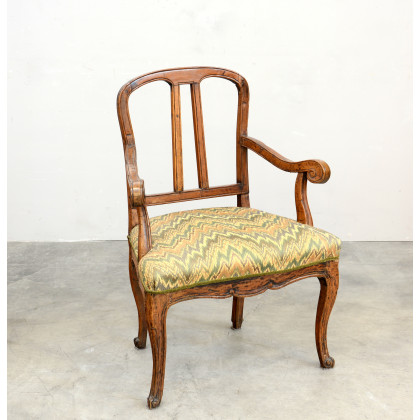 Poltrona in noce con schienale sagomato a giorno, braccioli, montanti e gambe mosse. Sec. XVIII (difetti)