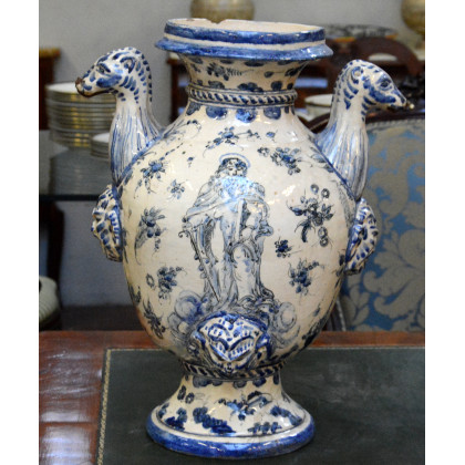 Manifattura secolo XIX, vaso in terracotta, decorato nei toni del blu, figure religiose. Anse e versatoio decorato in rilievo con animali fantastici e mascheroni (cm 47) (difetti e mancanze)