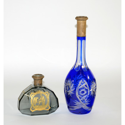 Manifattura di boemia, coppia di bottiglie di diversa forma con ghiere in metallo e argento mancanti di tappi