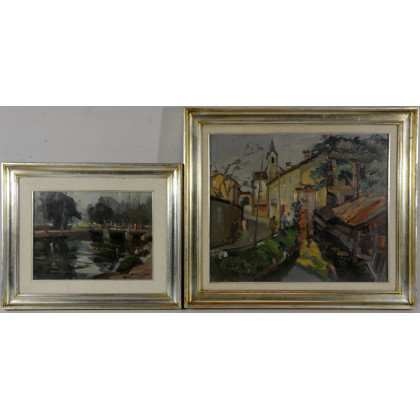 "Scorci di città" lotto composto da due dipinti di tecniche e misure diverse, firmati. In cornici