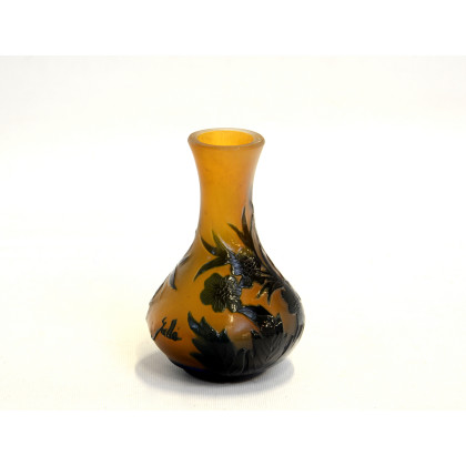 Piccolo vaso bulbiforme in vetro a cammeo inciso all'acido con soggetti floreali in giallo, verde e blu. Inizi sec XX. Firmato Gallé (h. cm 12)
