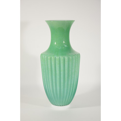 Grande vaso costolato in vetro incamiciato verde con inclusioni di polvere metallica. Base applicata in betro lattimo. Firmato a punta sotto la base. Anni 70/80 (h cm 52)