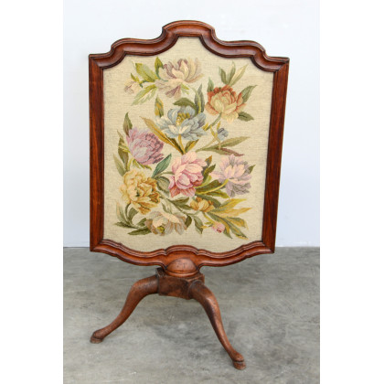 Parascintille di forma sagomata in noce decorato con stoffa a piccolo punto raffigurante fiori. Base a tre piedi sagomati. Sec. XIX (difetti)