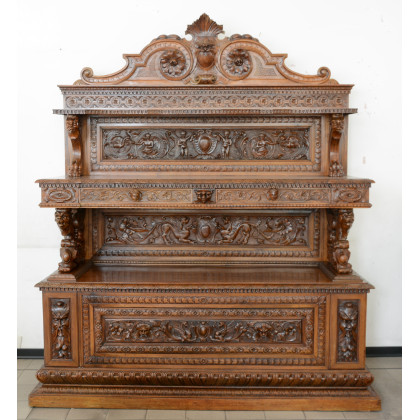 Credenza con alzata con pannelli intagliati a putti, stemmi e animali fantastici, montanti a figure alate, fascia a due cassetti con pomoli scolpiti a testine, cassetti nella base (cm 173x170x54) (difetti)