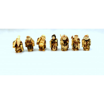 Arte orientale, gruppo di 7 sculture in osso raffiguranti personaggi, decorati in policromia a fiori e foglie. (Difetti)
