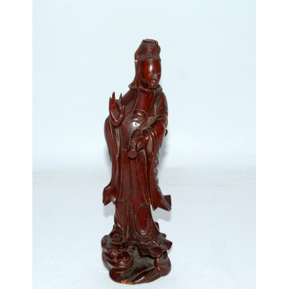 Scultura in legno dipinto raffigurante Guanyin stante (difetti) Cina sec. XX (h. 30 cm.)