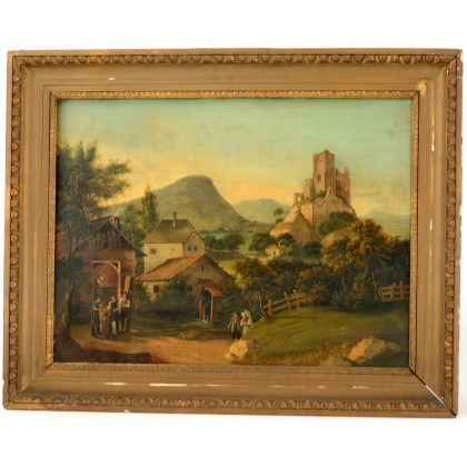 Scuola del sec. XIX "Paesaggio montano con figure" olio su lamiera (cm 48x64) In cornice coeva (difetti e restauri)