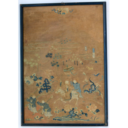Antico ricamo cinese raffigurante un dignitario a cavallo con servitori in un paesaggio fiorito (cm 71x49), in cornice (difetti)