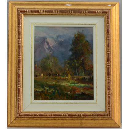 Firma indecifrata, "Paesaggio", olio su cartone, (cm 26x21), firmato in basso a destra. Iscritto al retro, in cornice (lievi difetti).