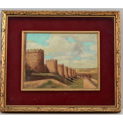 "Paesaggio con fortificazioni" olio su tavola (cm 24x32), firmato in basso a sinistra. In cornice (lievi difetti)