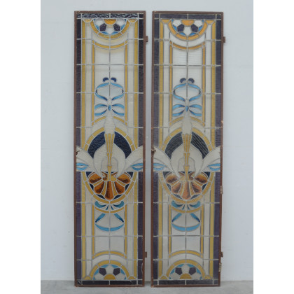 Coppia di vetrate policrome con vetri legati a piombo, decorate con fiocchi e rosoni, primi decenni secolo XX (cm 49x191) (difetti e restauri)