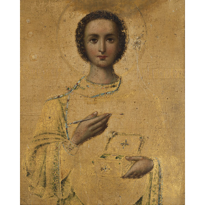 Icona russa raffigurante giovane santo, su fondo dorato (cm 31x26,5) (difetti)In cornice