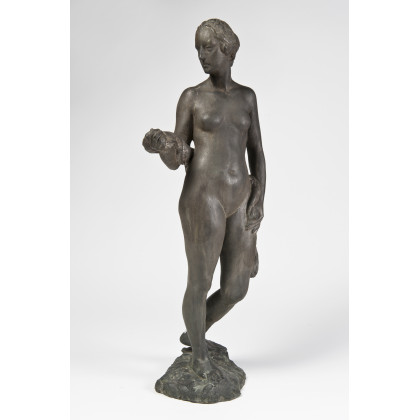 Scultura in bronzo raffigurante figura femminile stante con drappo. Prima metà del secolo XX. Firma indecifrata alla base (h cm 74) (lievi difetti)