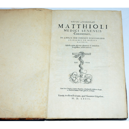 MATTIOLI, Pietro Andrea (1501-1578). Commentarii in libros sex Pedacii Dioscoridis Anazarbei de medica materia. Venezia: in officina Erasmiana, presso Vincenzo Valgrisi, 1554. Prima edizione illustrata. Folio (321 x 218mm). Marca tipografica al frontespizio, capilettera istoriati incisi in legno (alcune pagine proveniente da un’altra copia e altre manoscritte). Legatura in pelle del sec. XVIII (restaurata).