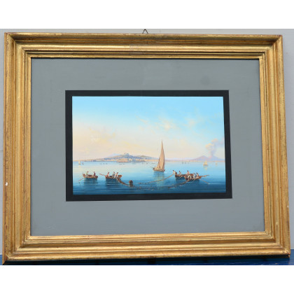 Scuola napoletana "Scorcio del Golfo di Napoli" guache su carta (cm 20x32) in cornice