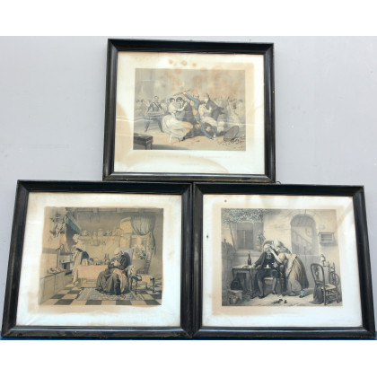 Lotto di tre litografie umoristiche a colori del secolo XIX, in cornici ebanizzate coeve (cm 52x62) (difetti)