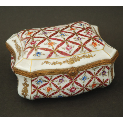 Scatola Manifattura di Sevres, in porcellana di forma bombata decorata in policromia a fiori con ghiera dorata (difetti)