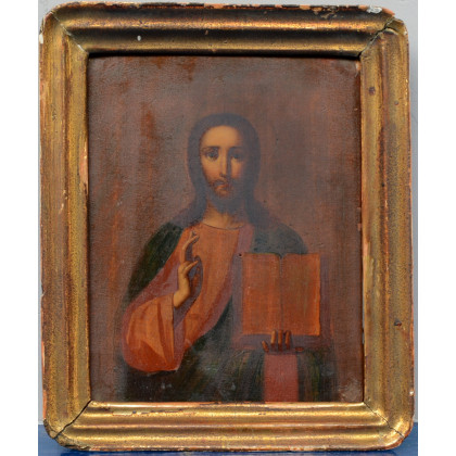 Antica icona russa su tavola raffigurante "Cristo"(cm 22,5x17,5) in cornice del secolo XIX (difetti)