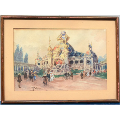 Scuola del secolo XIX "Padiglione della Fiera di Milano all'inizio secolo XX" acquarello (cm 21,5x32,5) reca la firma P.Sala in basso a sinistra, in cornice