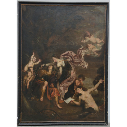 Scuola veneta del secolo XVII “Venere scopre Adone ferito o la tintura delle rose” olio su tela (cm 150x114) In cornice ebanizzata